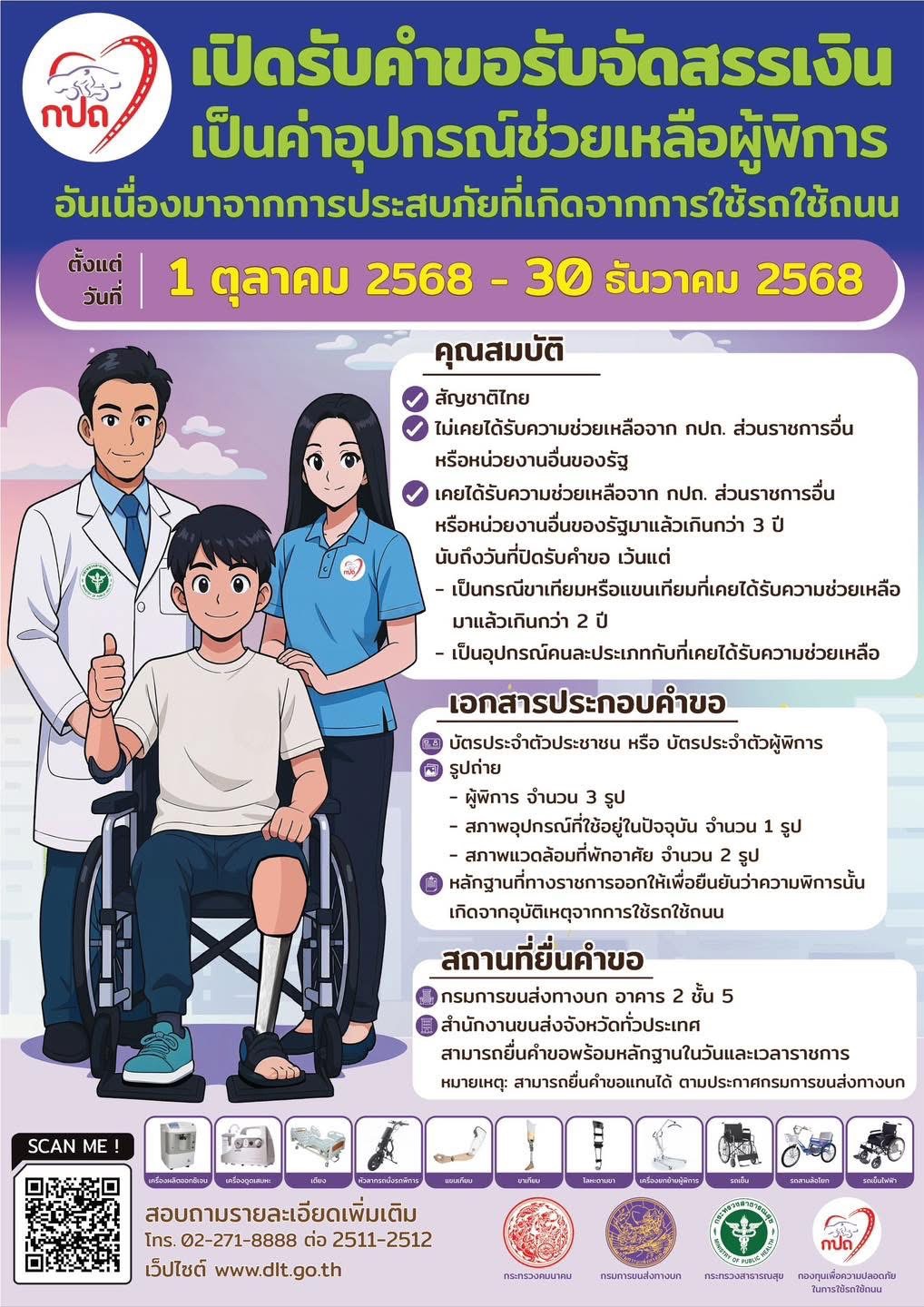 กรมการขนส่งทางบก เปิดรับคำขอรับจัดสรรเงินเป็นค่าอุปกรณ์ช่วยเหลือผู้พิการที่ประสบภัยจากการใช้รถใช้ถนน ประจำปีงบประมาณ พ.ศ. 2569 โดยสามารถยื่นคำขอและเอกสารหลักฐานได้ระหว่างวันที่ 1 ต.ค. â 30 ธ.ค. 2568 ณ กรมการขนส่งทางบกหรือสำนักงานขนส่งจังหวัดทุกแห่งทั่วประเทศ